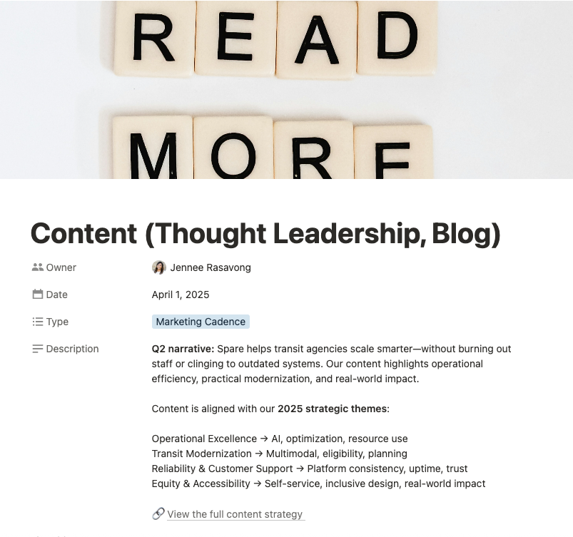 When I joined Spare, content was being created off the side of desks—there was no documented strategy, no editorial POV, and no shared calendar.
